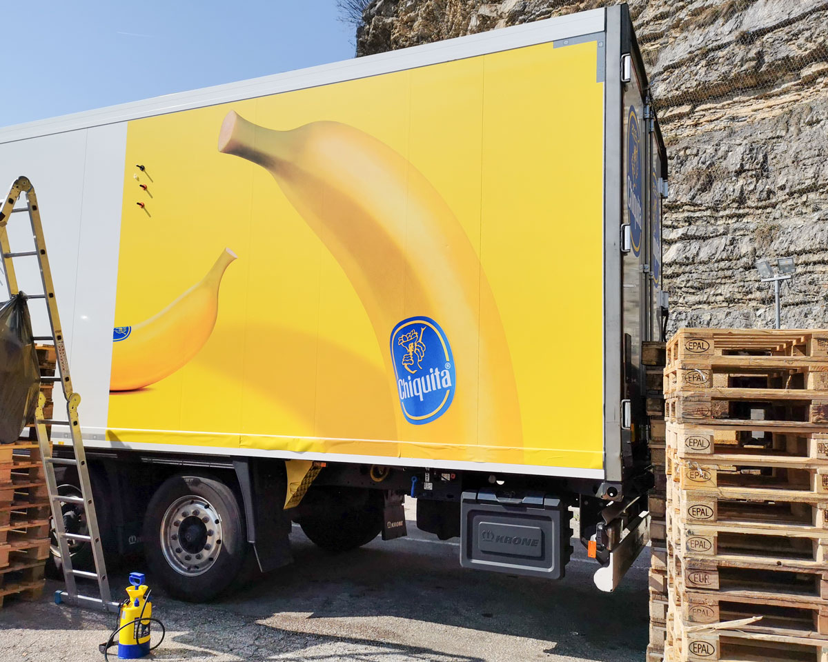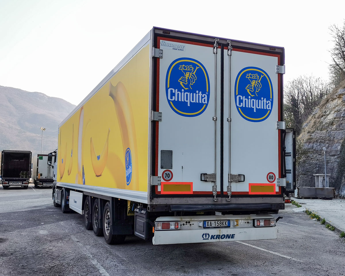 Per questo cliente, abbiamo realizzato la decorazione di un camion con una grafica d’impatto che esalta il brand e la qualità del prodotto. Il design vivace, dominato dal colore giallo e dalle iconiche banane Chiquita, rende il mezzo immediatamente riconoscibile su strada, trasformandolo in un’efficace pubblicità itinerante.