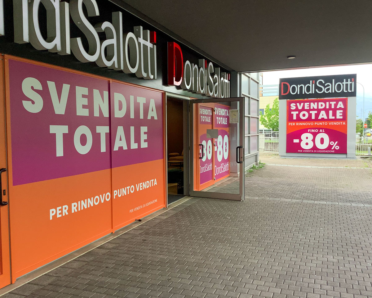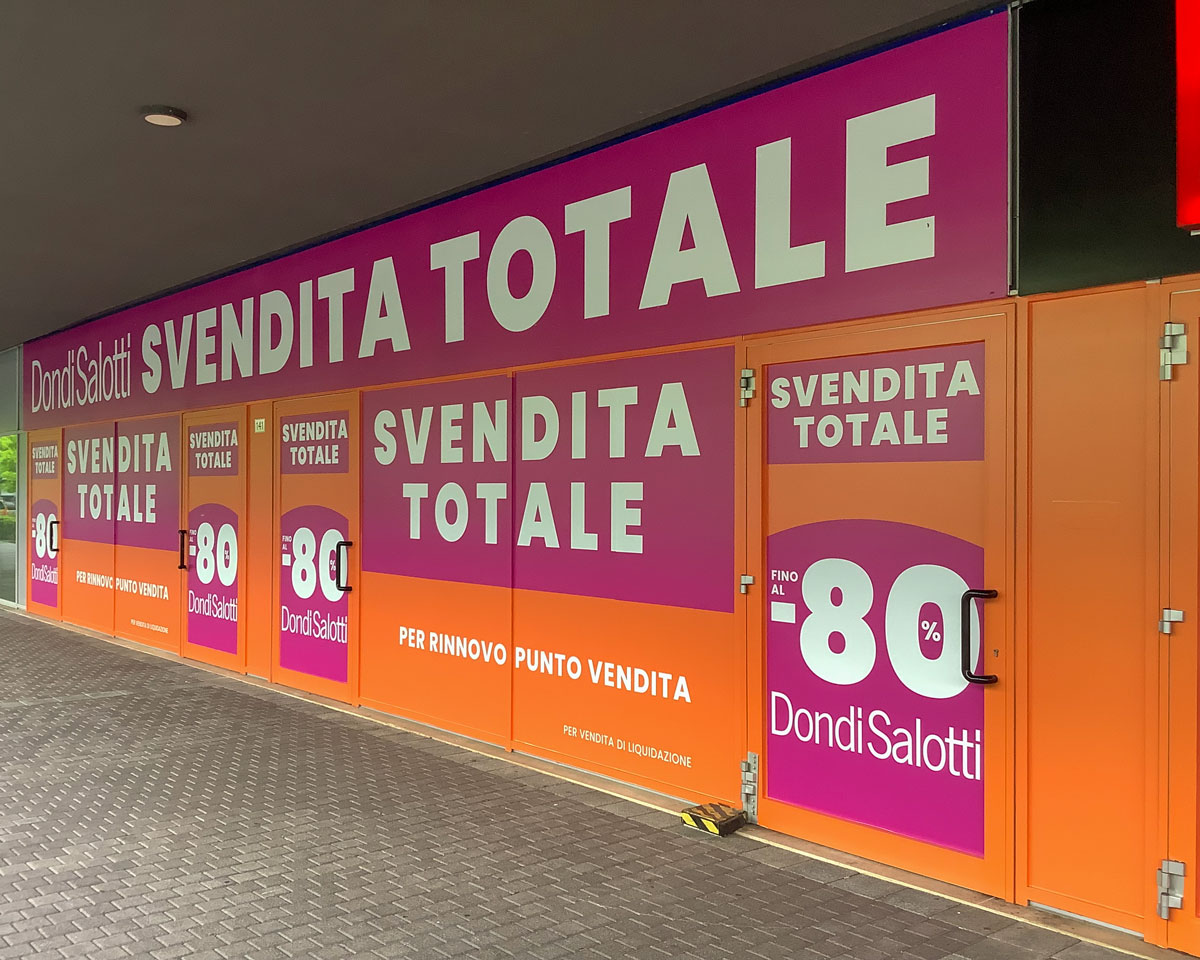 Per Dondi Salotti abbiamo trasformato la loro vetrina in un potente strumento di marketing, applicando una pellicola adesiva integrale con una grafica d’impatto per la campagna Svendita Totale – Sconto 80%. Grazie all’uso di colori vivaci come arancio e magenta, il messaggio promozionale risulta immediatamente visibile e accattivante.